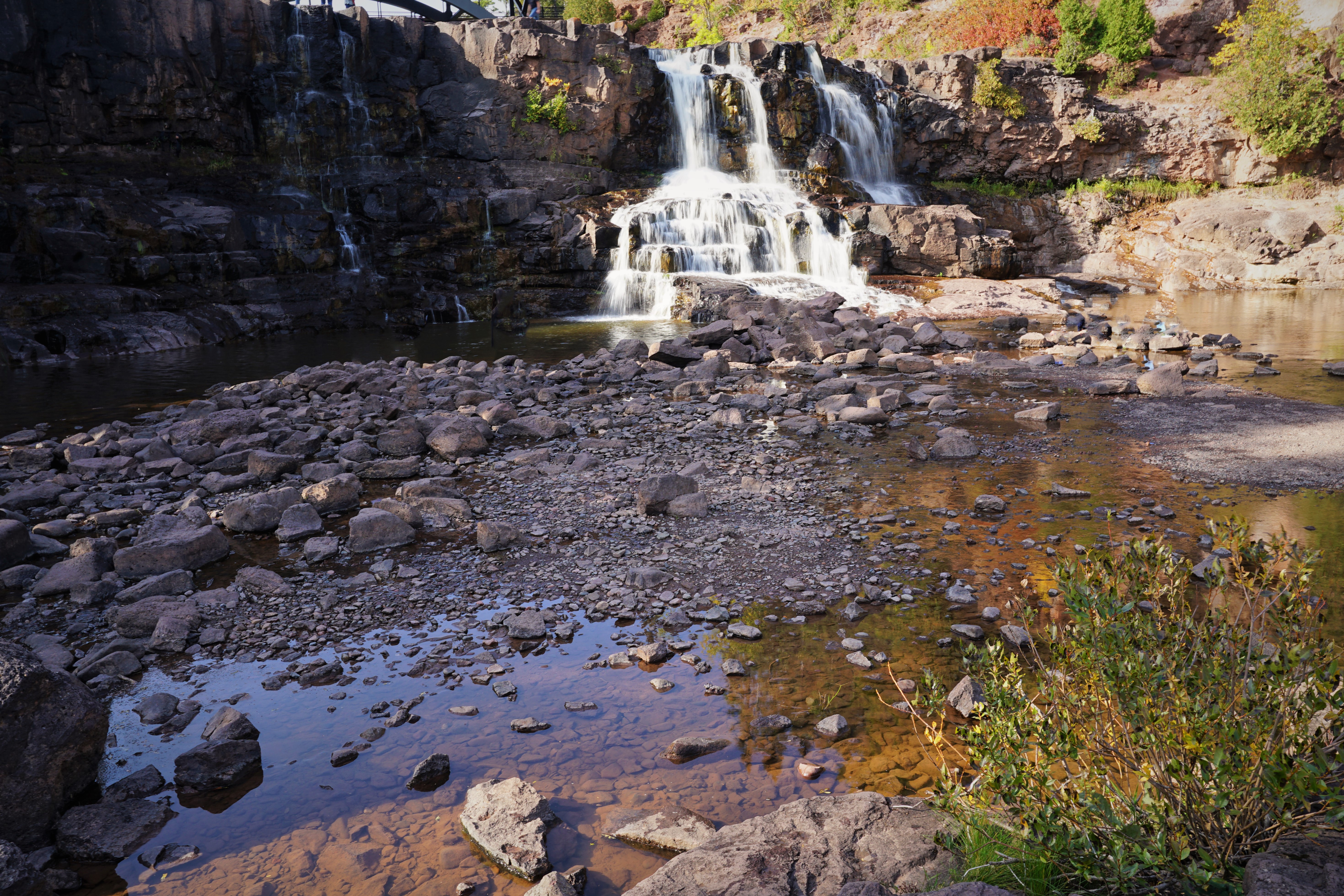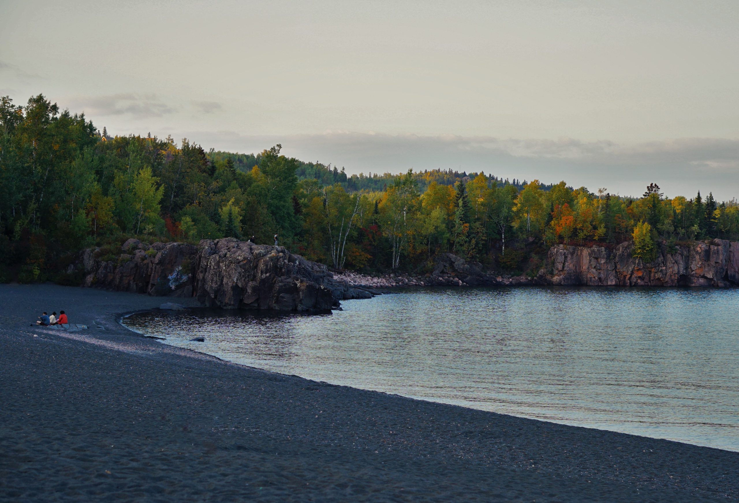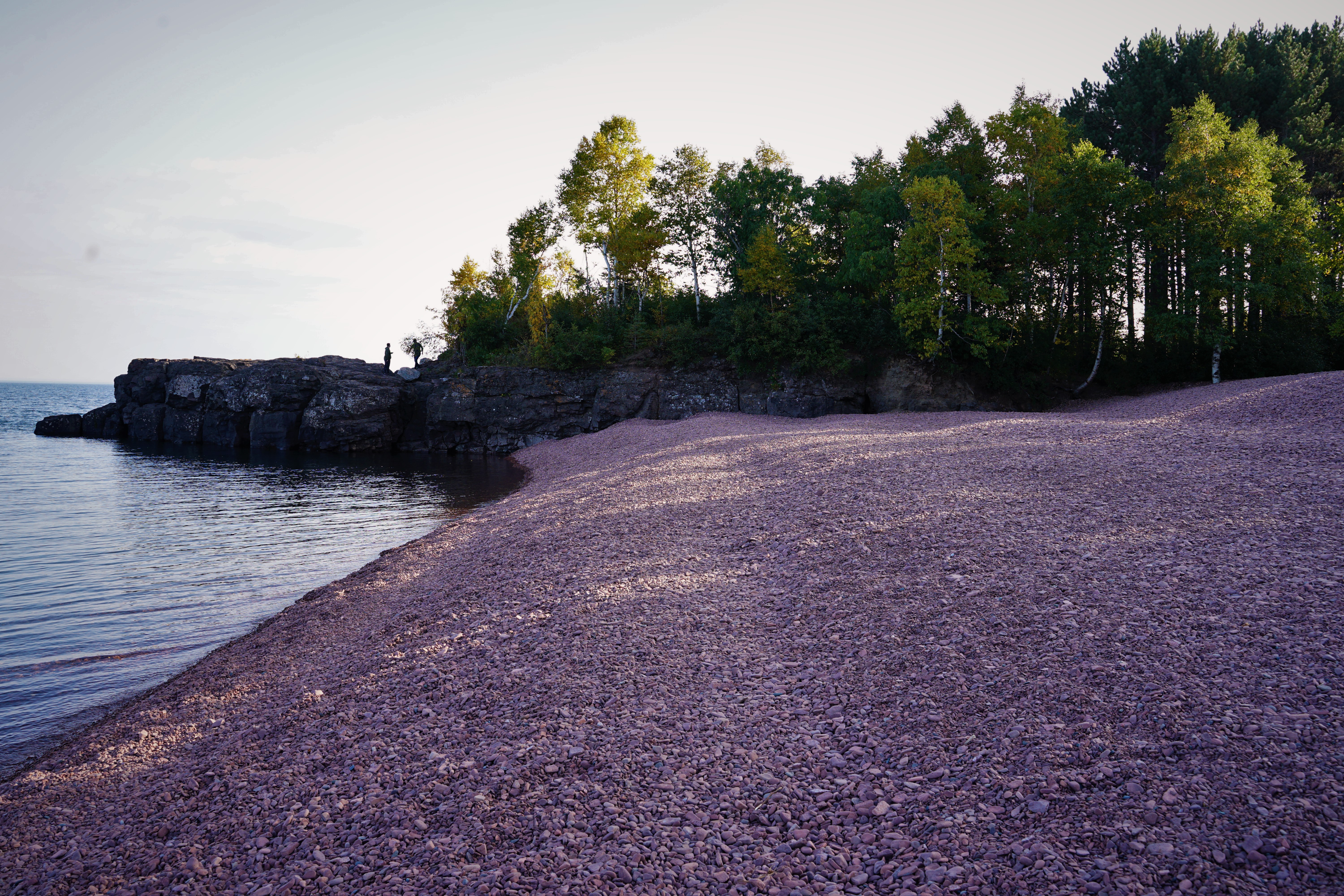 Iona’s Beach is truly a not-so-hidden gem. Not just because someone named Iona promised to keep coming back to her favorite spot on Lake Superior, but because the SNA (Scientific and Natural Area) deemed it ‘ecologically or geologically significant to Minnesota’. From the car, there is a short hike to the beach, and we were fortunate to see this trail in fall colors! This lovely beach is a 300-yd salmon and pink colored crescent. It was created by lava which poured from a fissure in the earth’s crust called the Mid-Continental Rift. When waves crash onto this beach, the rocks tumble against one another and create a high-pitched tinkling sound, thus earning Iona’s Beach the name ‘singing beach’. (More more info on Iona Beach, click HERE).
