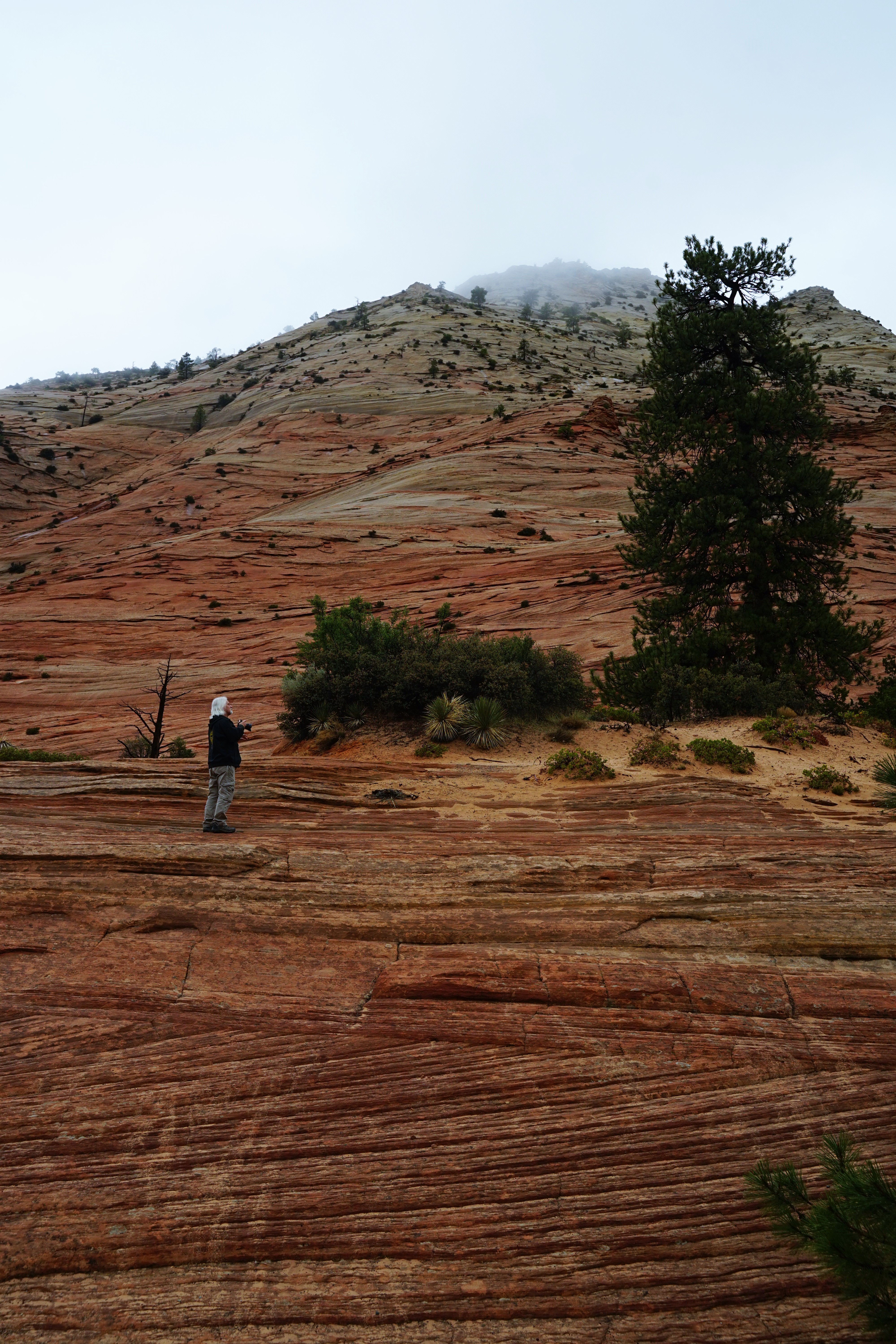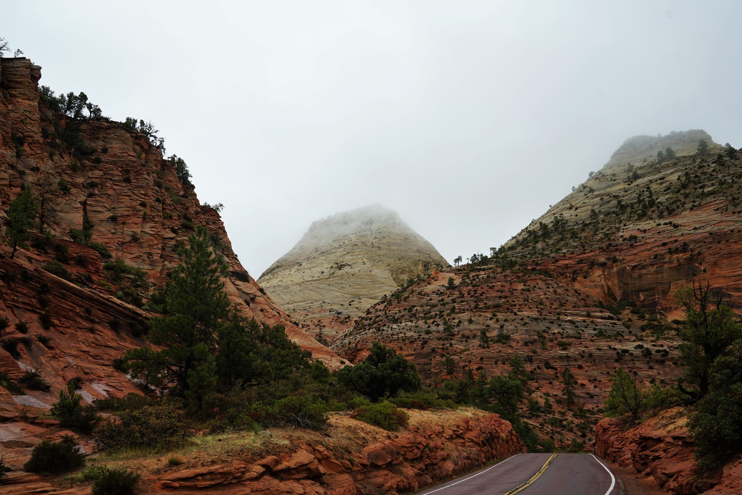 Zion was, hands down, our favorite National Park of the SW. It definitely had the ‘wow’ factor as we drove in from the east entrance. As we drove along Hwy 9 into the park, we entered a whole different world! A wet and rainy assortment of spiraled mesas glistening in the mist, greeted us as we drove through the Mt. Carmel tunnel. The view from the west side of the tunnel was completely different. What we saw there were pine trees nestled in a mountain landscape with sheer rock faces soaring into the haze. What a reception all that rain and fog gave us as we made our way to the campground to get set up!