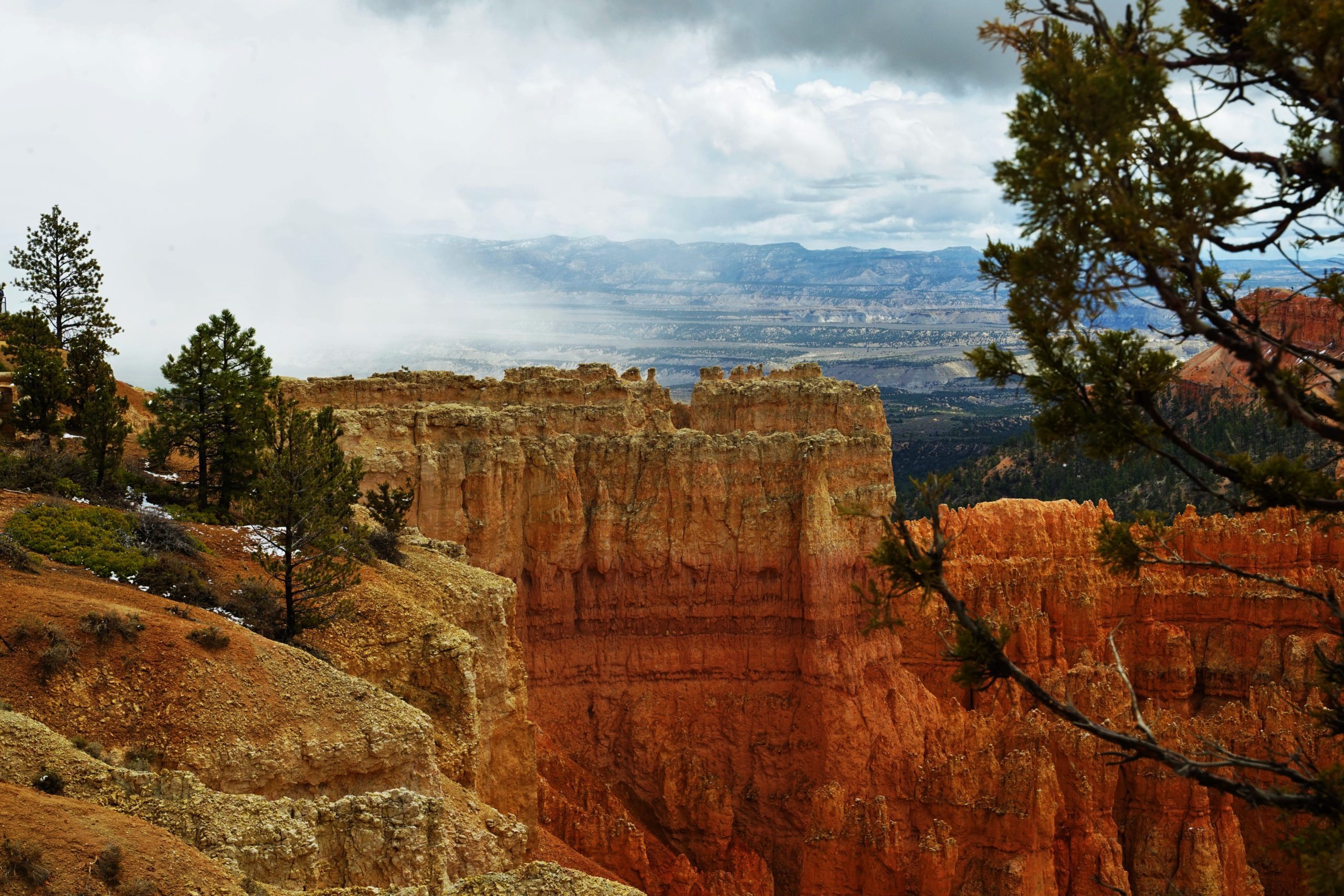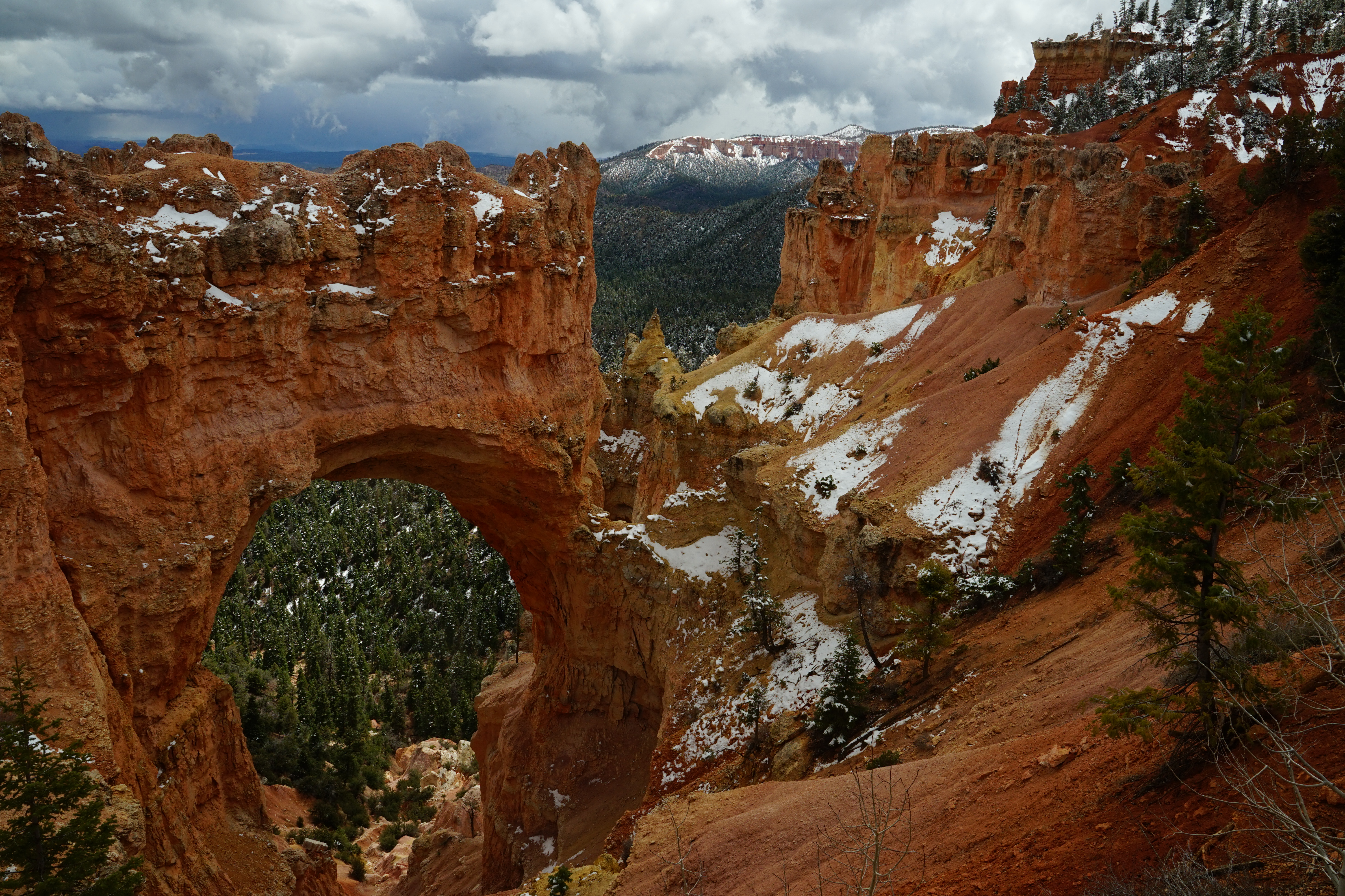 From this point there are also number of great hikes. We opted to head down the Wall Street Trail just to get a feel for being down among the giant sculptures (called ‘hoodoos’). From here we drove down to see the Natural Bridge. Its only about a 20 min drive, but there are a few stops along the way. Natural Bridge is definitely worth a look! By starting our time at Bryce in the sunshine, we got to see the hoodoos lit up by the sun. But by the time we got back to the visitor’s center it was snowing heavily and pelting us with hail. Stopping back in at Sunset Point for a few photos, gave us views of the hoodoos in the snow. We absolutley loved this park and we’re coming back to do some more hiking!