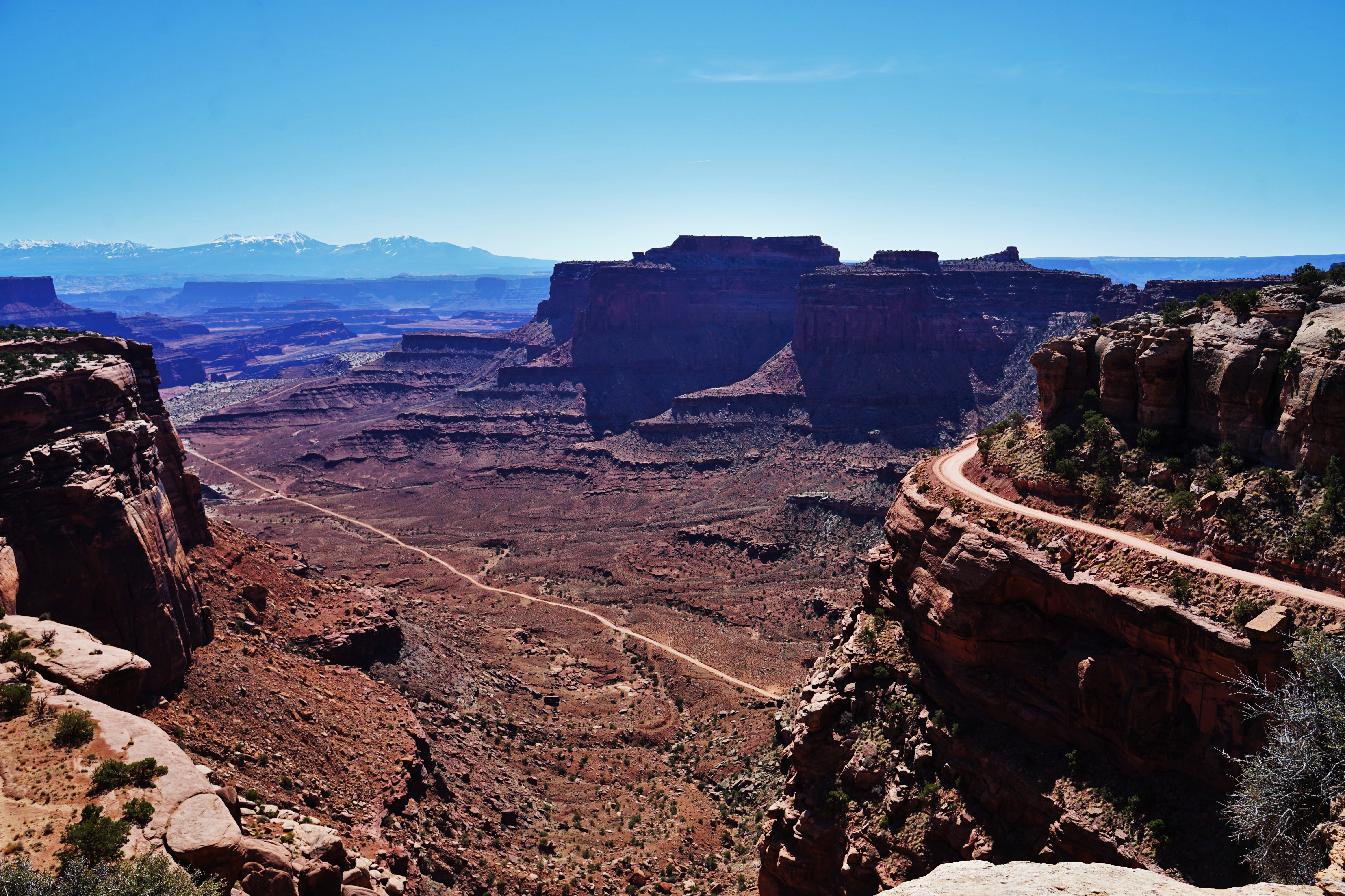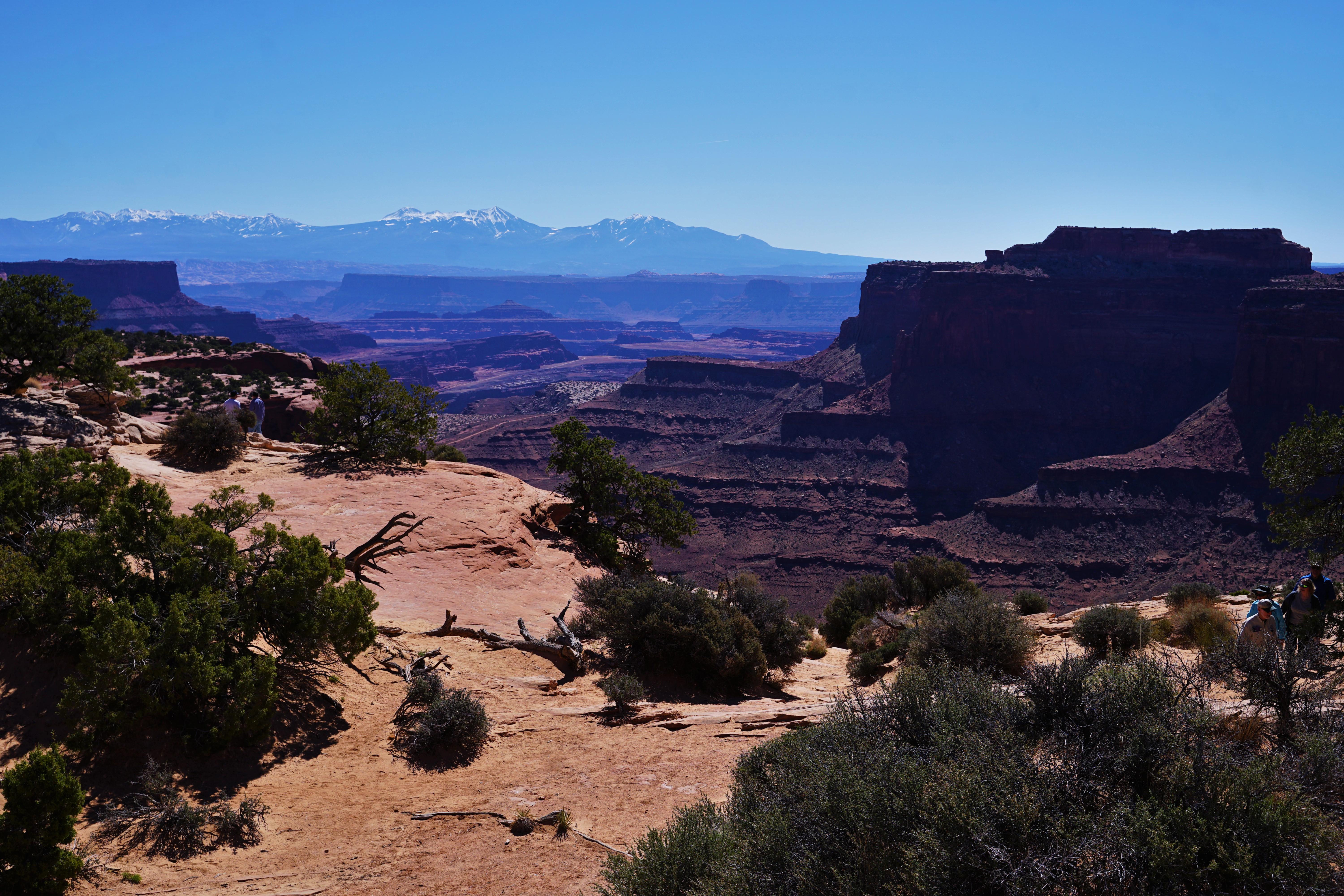 The plan had been to get up early and drive into the park, hike to the Mesa Arch for sunrise photos, and enjoy a tailgate breakfast. It was a great plan. So…we slept in until 9. Canyonlands was the last national park for this trip, and because we’d been dealing with the rain, snow, and wind the entire trip, we were a little weary. As beautiful as all this weather was, it was a challenge to be camping in. On this day, it was sunny and warm, and the skies were sapphire blue. It was the first time we could enjoy some time at camp outside, so we just relaxed and enjoyed brunch. Sunrise photos would have to wait until next time around.